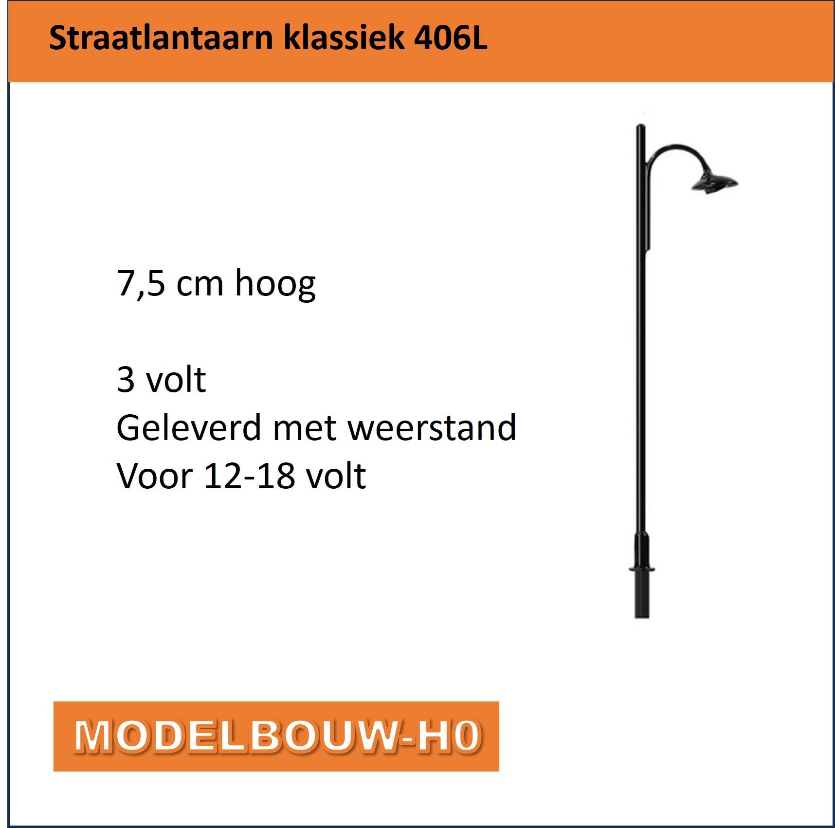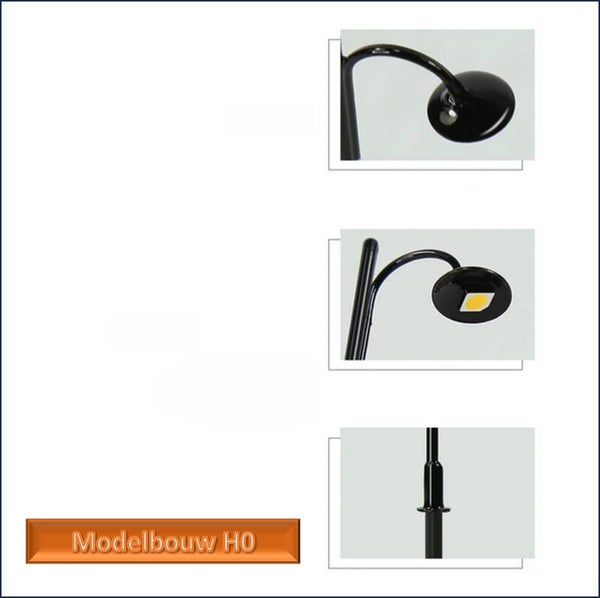 Straatlantaarn klassiek met warm witte LED lamp, 20 cm aansluitkabel.H0 modelbouw75 mm hoog3 volt Geleverd met weerstand voor 12-18 volt voedingWerkt op AC en DCOpgenomen vermogen 20mA