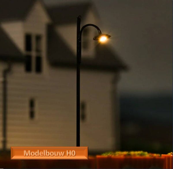 Straatlantaarn klassiek met warm witte LED lamp, 20 cm aansluitkabel. H0 modelbouw 75 mm hoog 3 volt Geleverd met weerstand voor 12-18 volt voeding Werkt op AC en DC Opgenomen vermogen 20mA