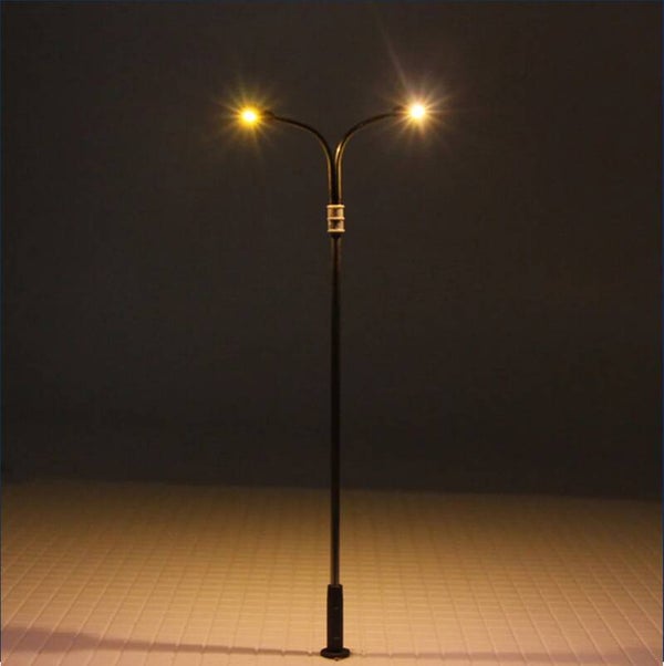 Straatlantaarn modern met dubbele warm witte led lampen met warm witte LED lamp, 20 cm aansluitkabel. H0 modelbouw 100 mm hoog 3 volt Geleverd met weerstand voor 12-18 volt voeding Werkt op AC en DC Opgenomen vermogen 20mA