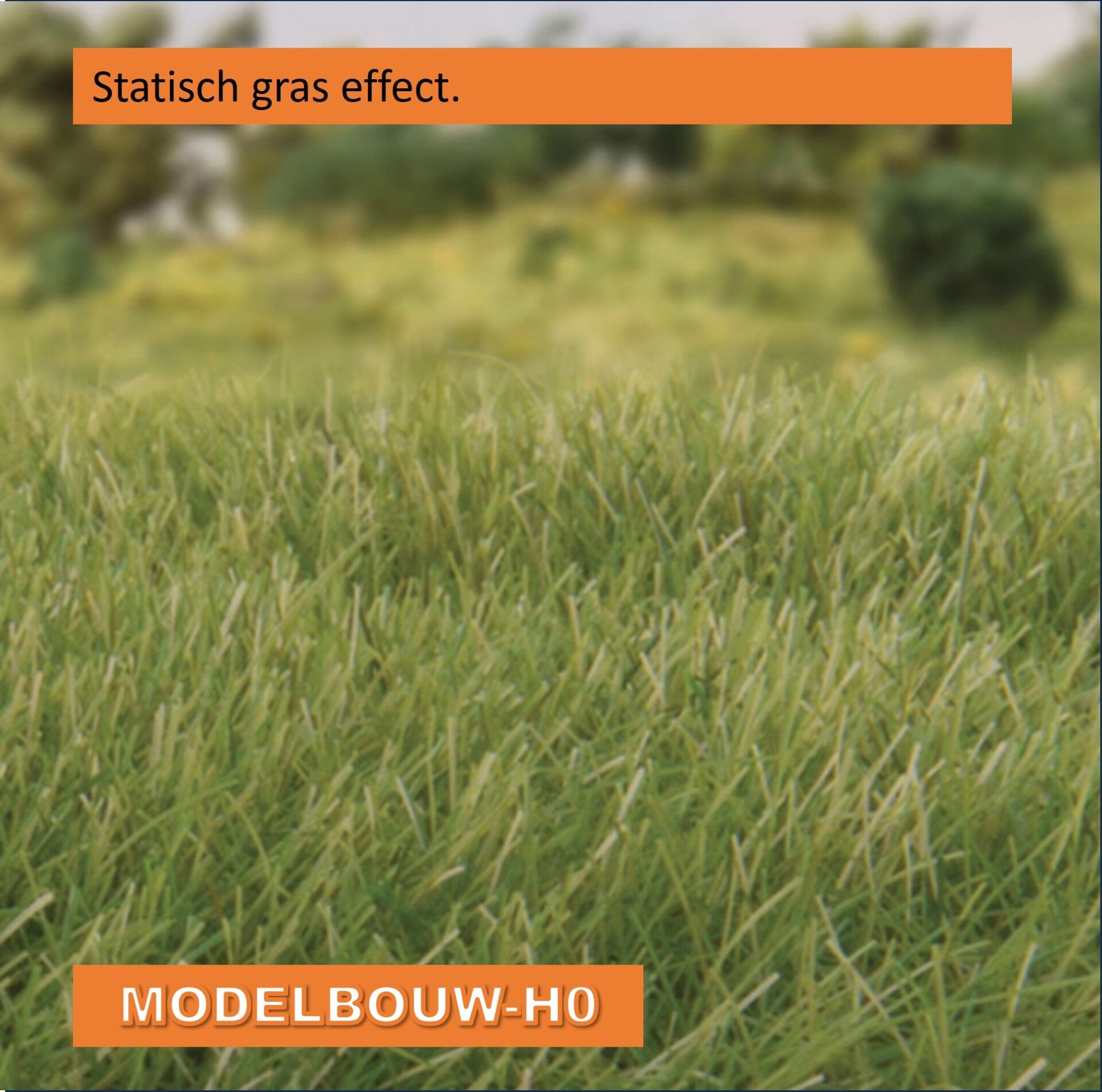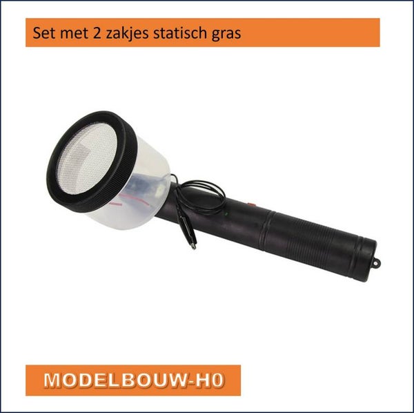 De werking is verbluffend eenvoudig, je strijkt houtlijm op de treinplaat, die dat niet te zuinig. Vervolgens gooi je statisch gras in de gazenhouder. Nu moet je de aardklem aarden aan je treinplaat dat kan via een speld of een spijker. nu zet je de strooier aan en draai je de strooier om. Je zult zien dat de gras vallen op je treinbaan en ze blijven rechtop staan, door te schudden vallen er meer grasjes, doe ver vooral voldoende op de treinbaan voor een goed resultaat. Wacht dat de hout lijm droog en en haal het overbodige - losse - gras weg met een stofzuiger, als je de grasjes opvangt kun je ze opnieuw gebuiken.