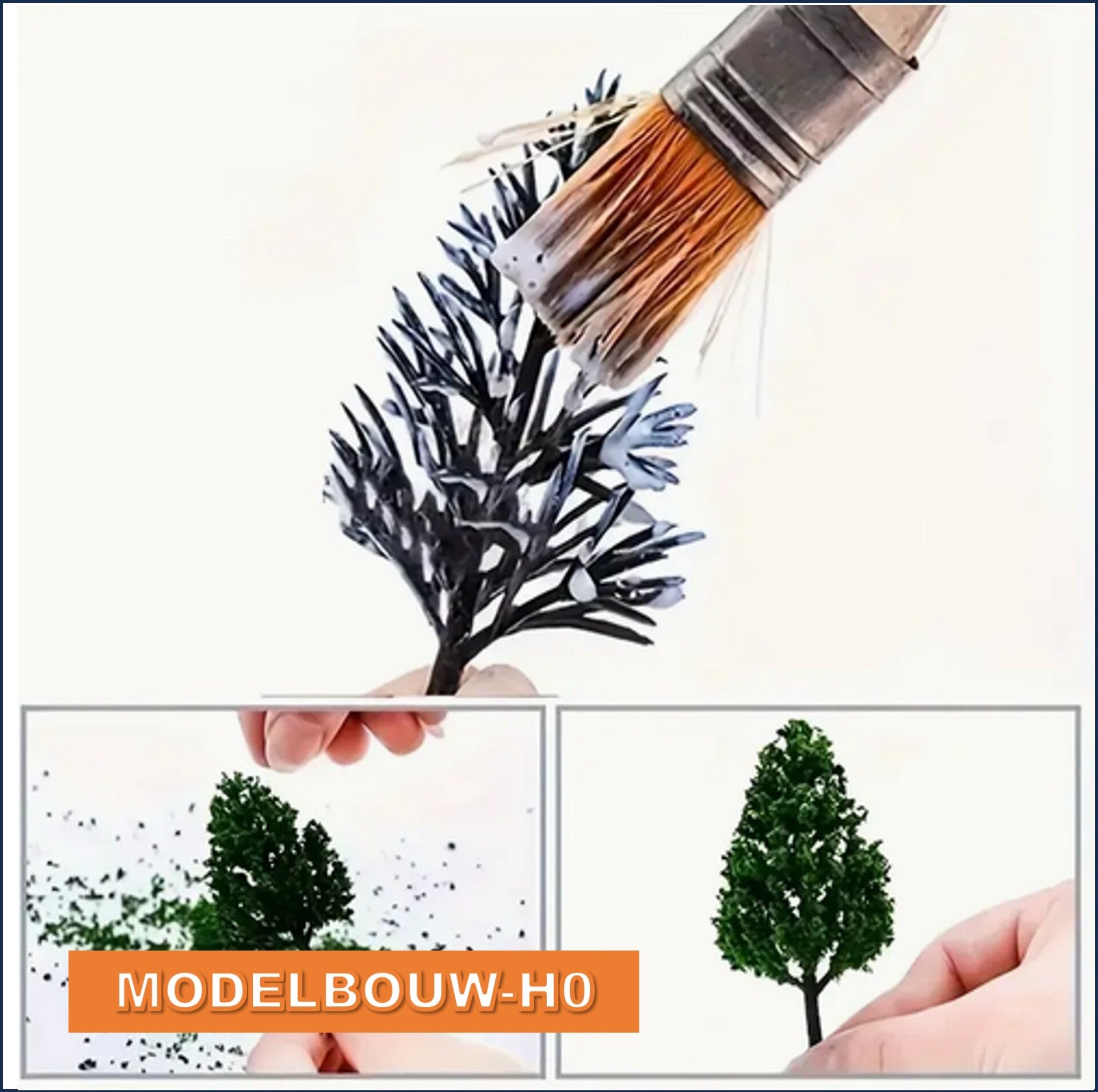 Loof zou ik aanbevelen aan te brengen met houtlijm welke de op een kale boom strijkt, of een rotswand of je treinbaan, maar ook een muur/wand van een huis kan goed voorzien worden van loof als zijnde klimop.