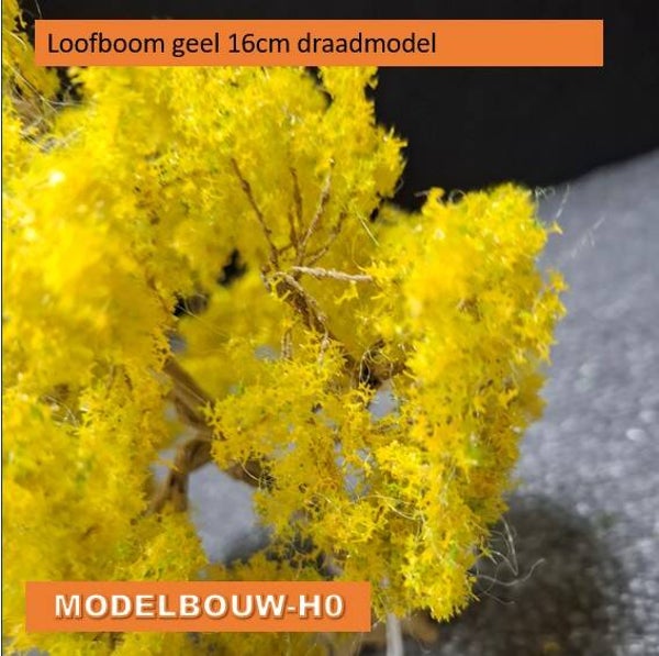 Loofboom geel 15 cm draadmodel met wortels en fraai afgewerkte stam, voor de liefhebbers van detail. Door het draad zijn de takken te buigen en aan te passen op de situatie waar de boom komt, zo kun je hem extra dicht bij een huis plaatsen als de takken omhoog zouden moeten. Kortom er is altijd plek voor deze opvallende verschijning op elke treintafel.