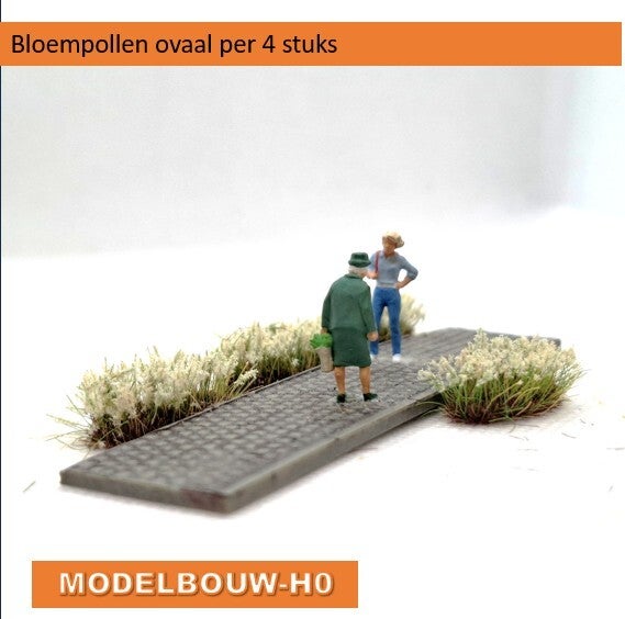 Deze pollen zijn fraai voorzien van bloemen, natuurlijk kun je er een aantal uithalen als je ze teveel vind. Gebruik de bloemetjes opnieuw als strooisel. ze zijn 8mm hoog, maar kunnen nog een stukje afgeknipt worden zodat ze lager zijn. Verder is het handig als je ze langs een huis, muur of hek plaatst ze doormidde te knippen en sluiten ze beter aan bij de muur, overigens heb je er dan twee om dit te herhalen.