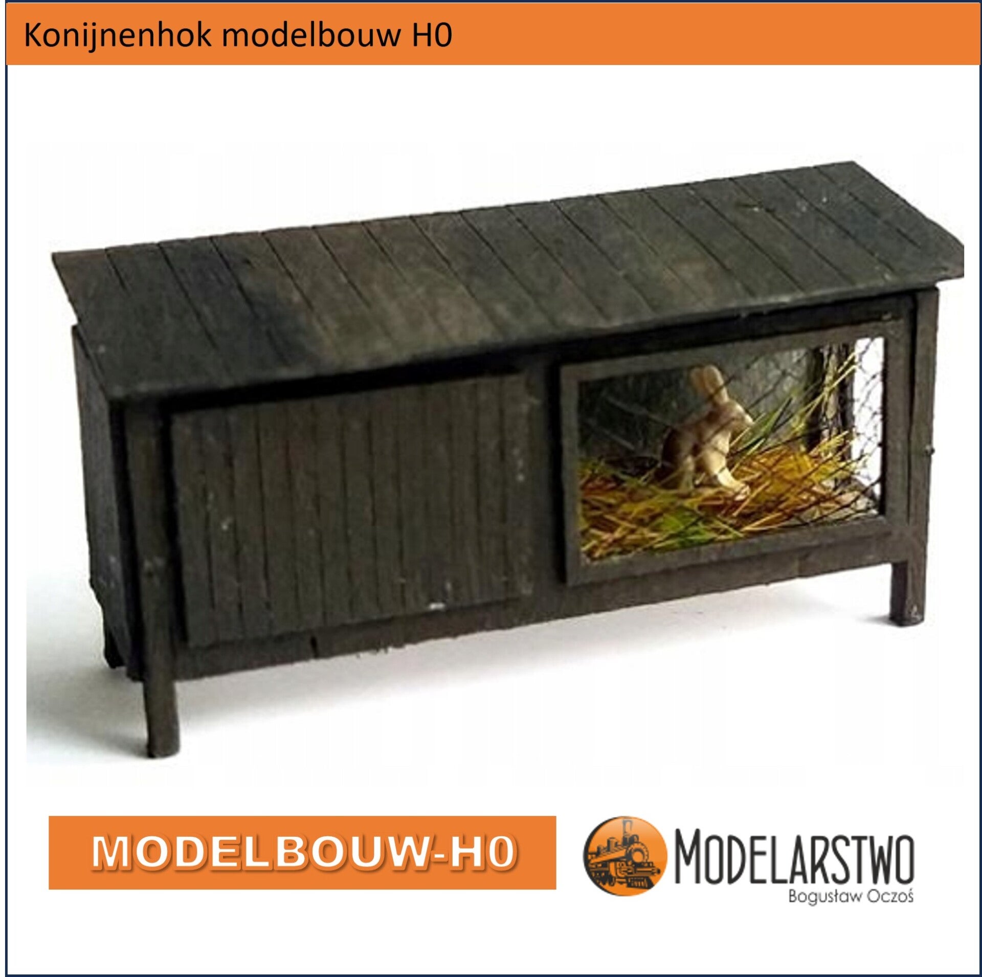 Het konijnenhok overal inzetbaar, gemaakt van lasercut hout en karton, en gaas. Met wat geduld en eigen inbreng maakt u een schitterende aanvulling op uw treinbaan.