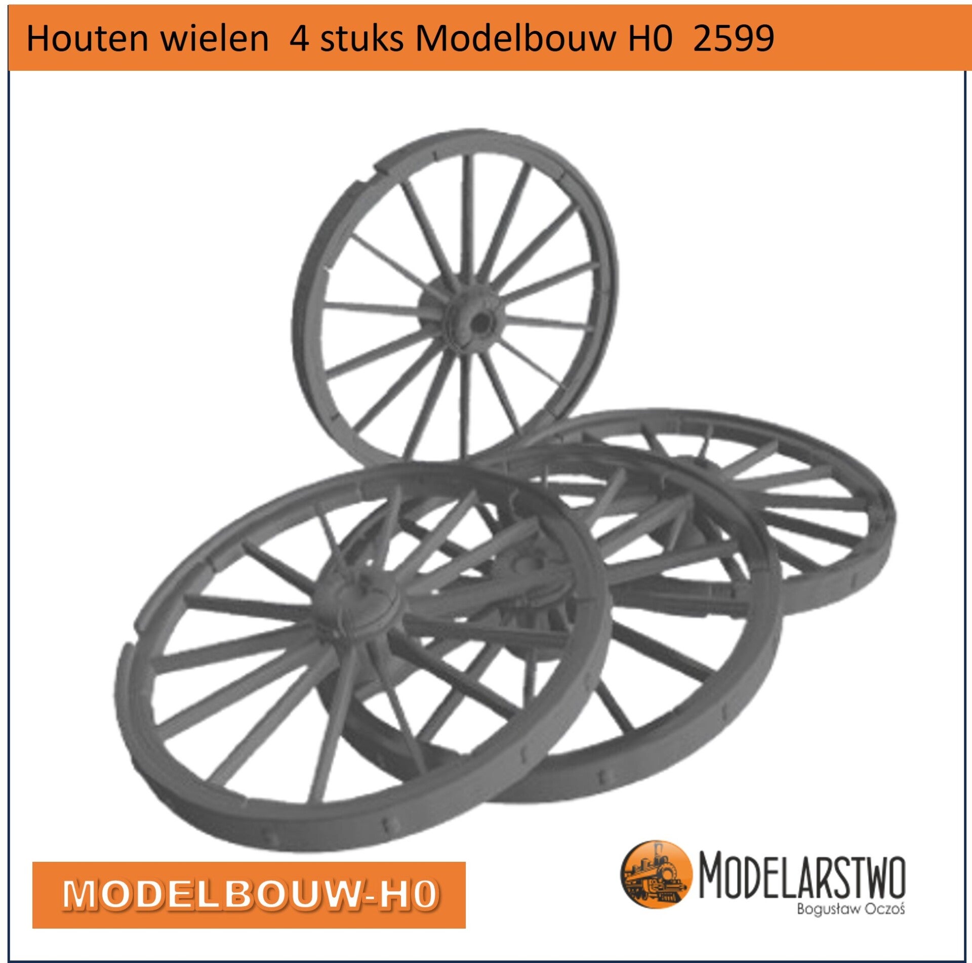 Vier houten wielen van een paardenkar, in de H0-schaal (1:87) en is perfect voor diorama's en H0-modellen. Het moet geverfd worden, zodat het volledig naar eigen wens aangepast kan worden.