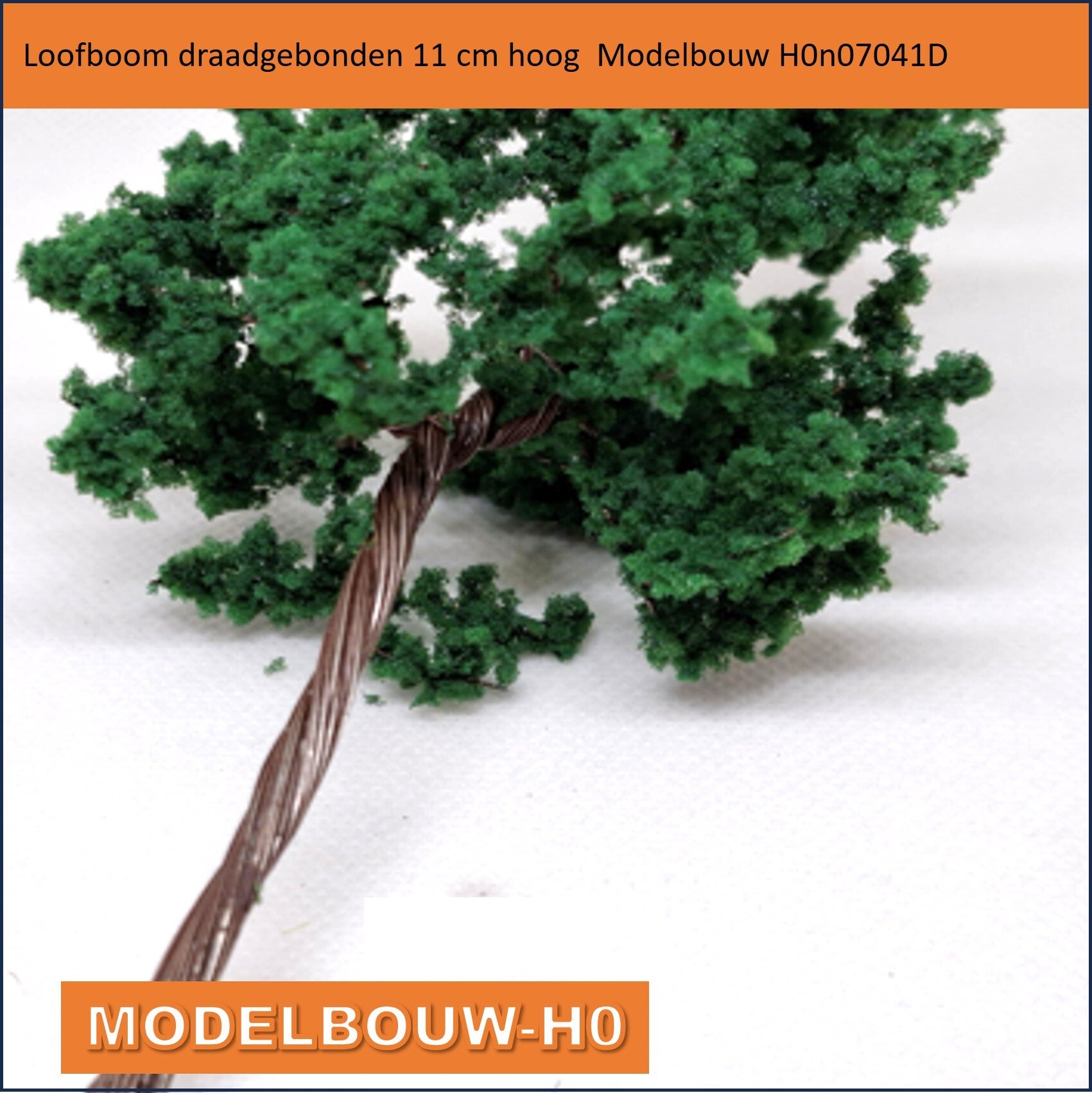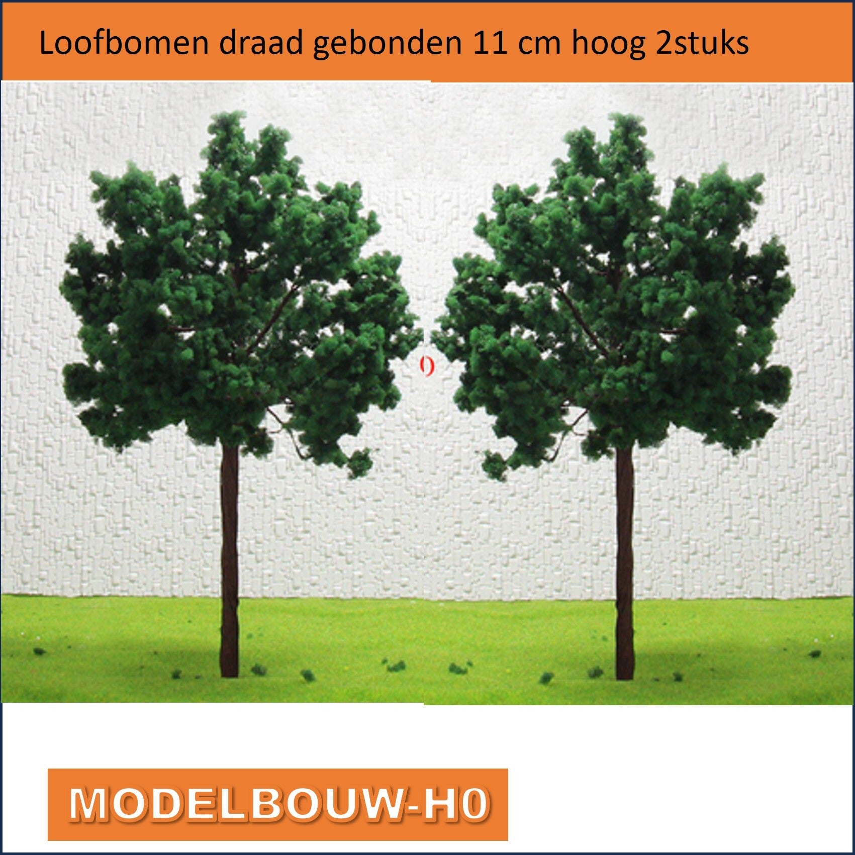 Loofbomen 2 stuks draadgebonden 11 cm hoog met groene flock bekleed, en een gebruinde stam en takken. Deze bomen zijn zeer geschikt voro je treinbaan of diorama en zijn mooi gemaakt.