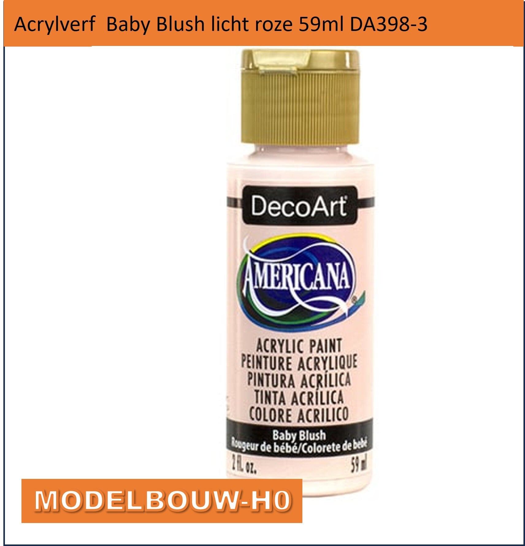 Americana van DecoArt Baby Blush is een licht roze kleur - blos op de wangen - kleur. Americana is een premium acrylverf met matte afwerking. De verf is sterk gepigmenteerd, romig van structuur en levert superieure dekking op talloze ondergronden. Waterbasis, niet-giftig, snel droog en na uitharding permanent en licht vast. Ideaal voor kunst, hobby en home-decor projecten. Deze Acrylics is onderling mengbaar en kan afgewerkt worden met vernis.