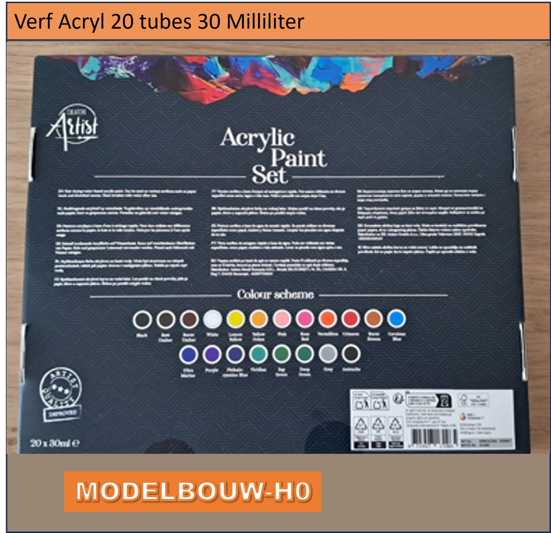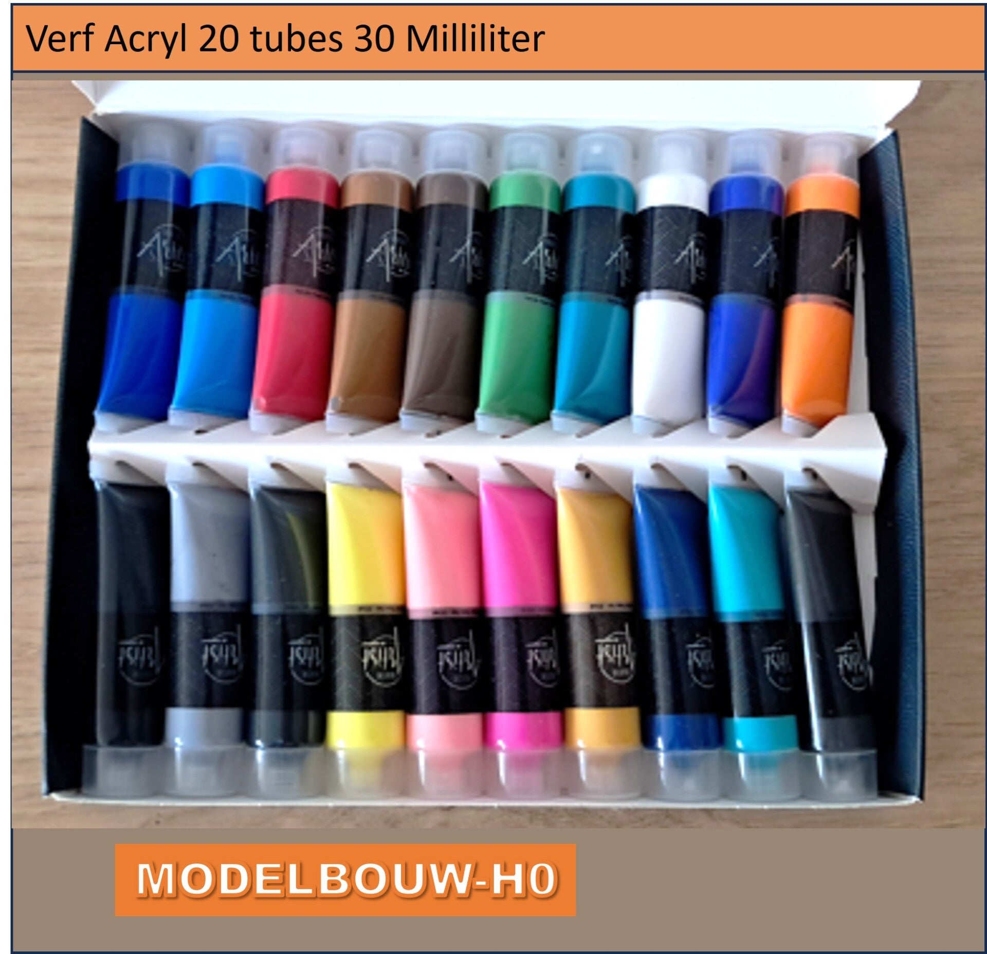 Met deze set bestaande uit 20 tubes acrylverf, met uitgezochte kleuren voor Modelbouw. Kunnen alle denkbare kleuren gemaakt worden. in tubes van 30 ML.