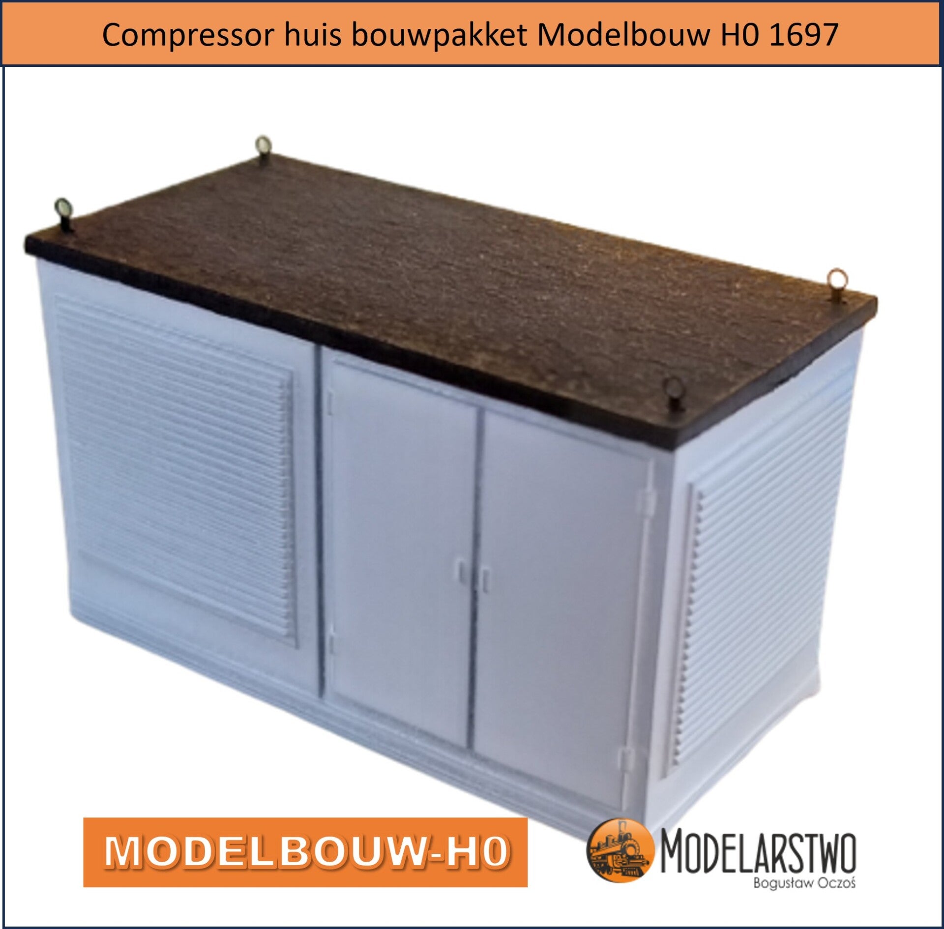 Compressor huis, gemaakt van laser gesneden karton, hars, nikkelsilver, en bedrukte sticker, een mooie bouwpakketje die voor de proffesionele modelbouw zeker nog een eigen inbreng geeft. Geschikt als ladig of als unit op het industrieterrein of locomotiefloods.