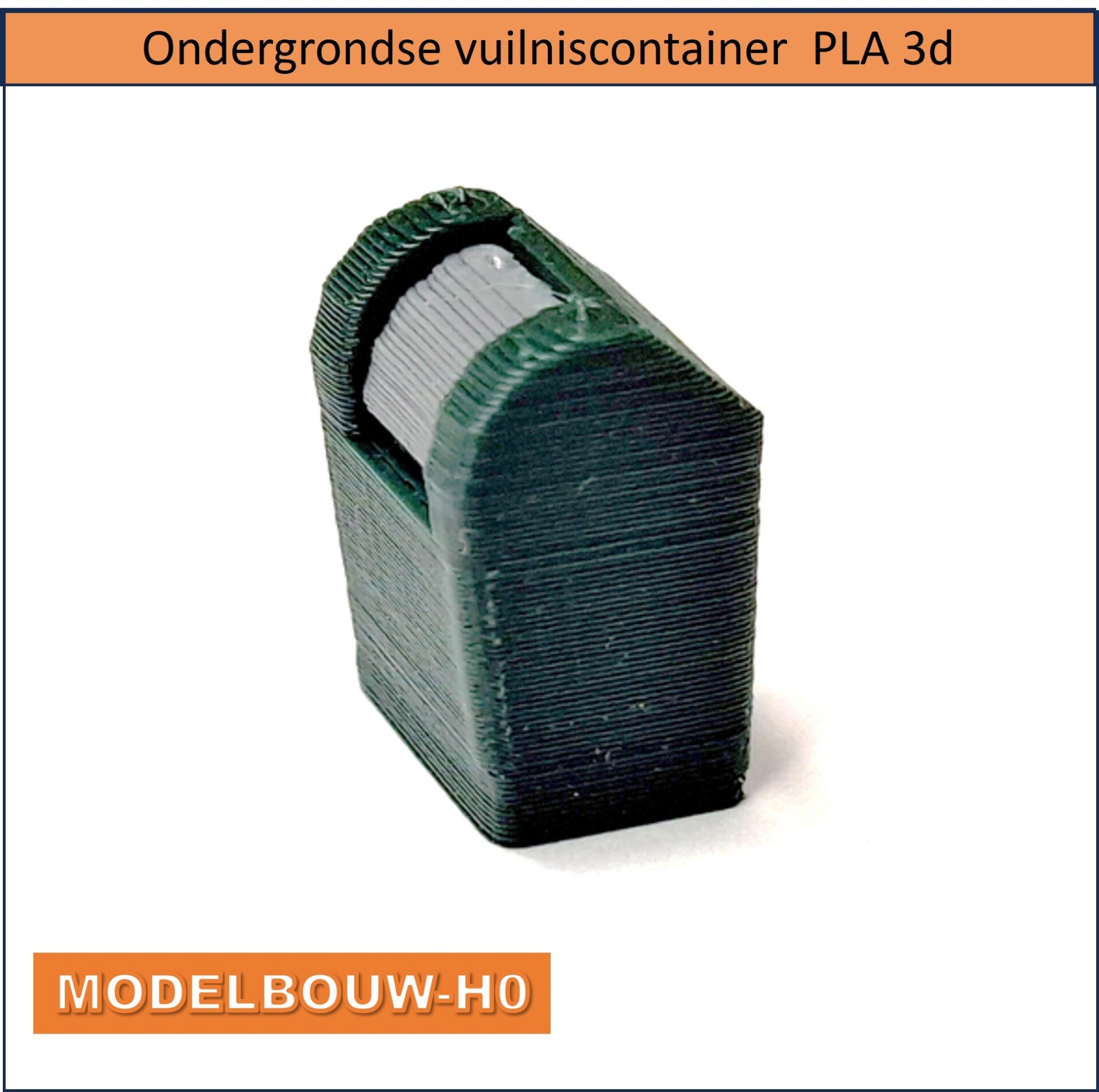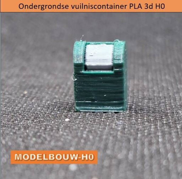 Deze ondergrondse vuilniscontainer is in kleuren met PLA* gemaakt door een 3d printer, nog een beetje bijwerken en eigenlijk klaar om op je treinplaat te zetten. De proffesionele modelbouwer zal er zeker nog wat verf op aanbrengen met het oog op de werklijkheid, voor een geweldig resultaat.